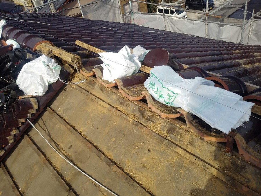 屋根瓦を撤去し、野地板の状態を確認します。
