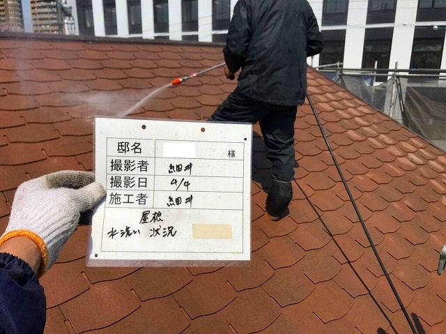 高圧洗浄で汚れや古い塗膜を洗い流します。