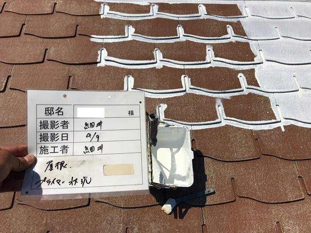 屋根材と上塗り材を接着させるために下塗り材を塗装します。