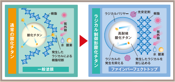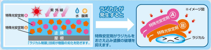 紫外線によって発生するラジカルという塗膜を破壊させる劣化因子をおさえこみ、