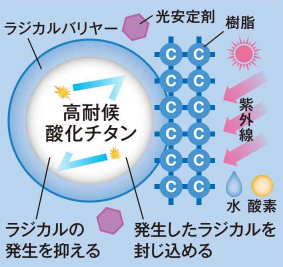 紫外線に弱い顔料(酸化チタン)をラジカルバリヤーで覆い