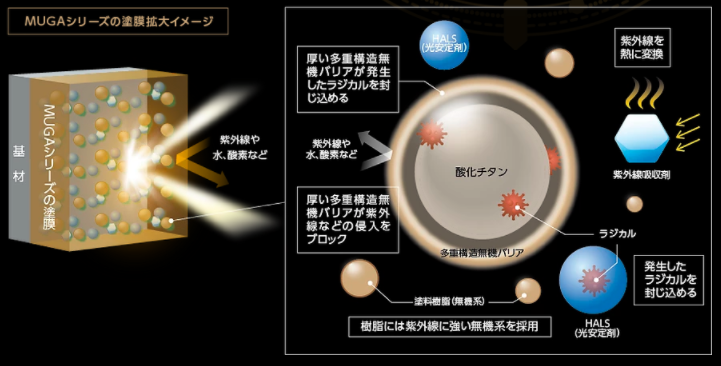 ①多重構造無機バリアで酸化チタン(白顔料)を