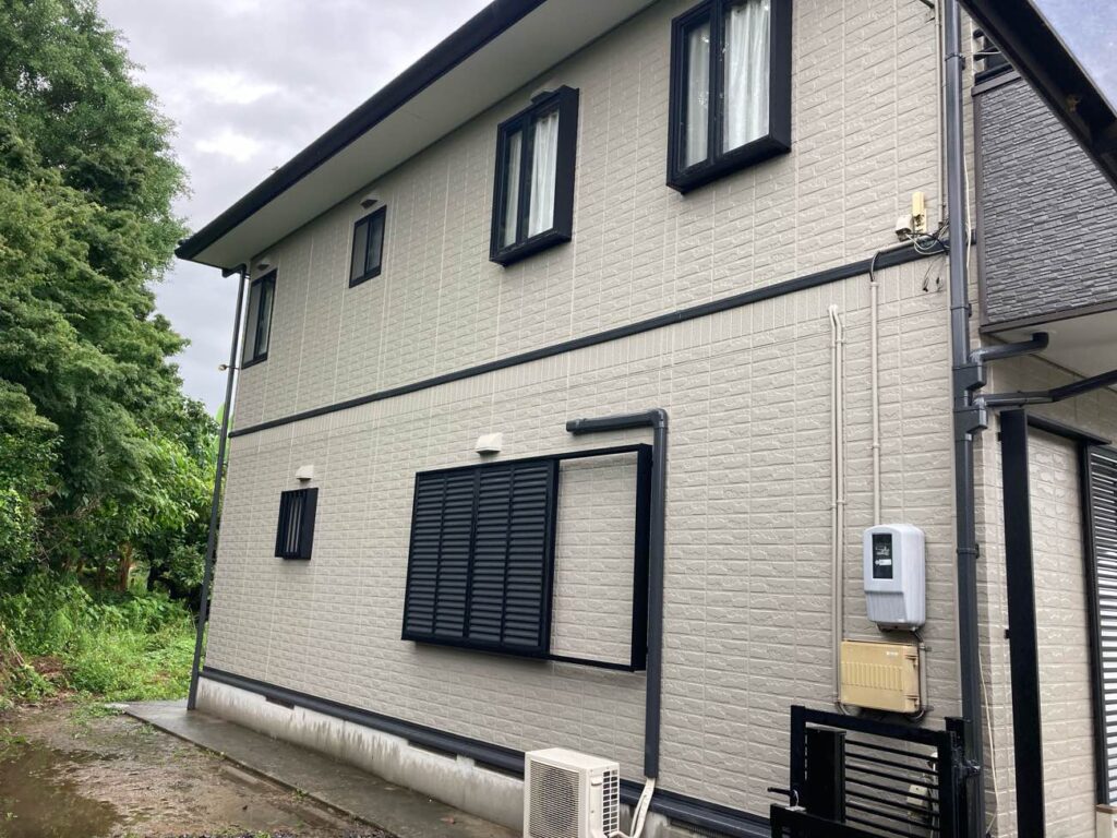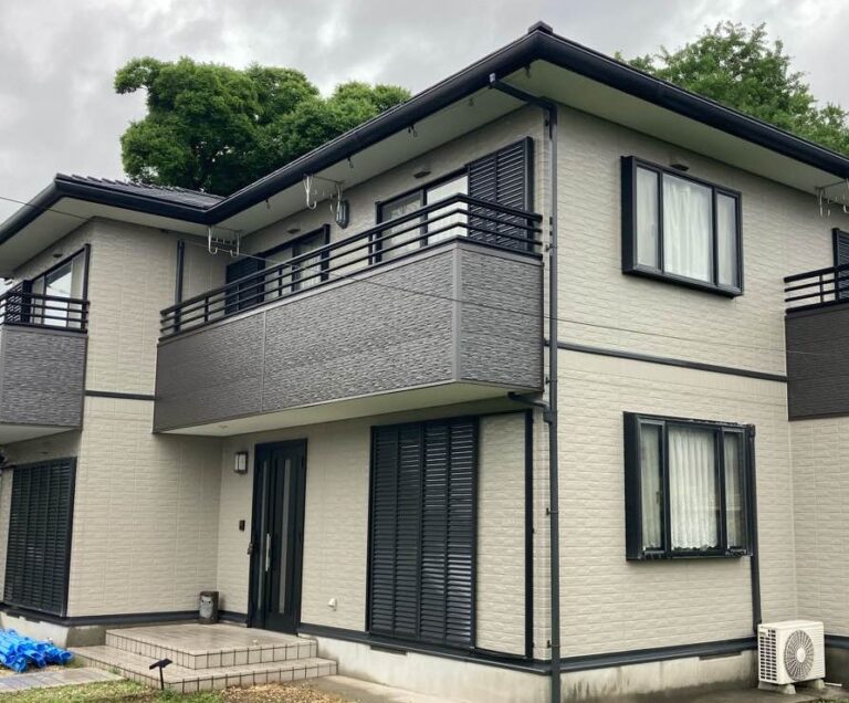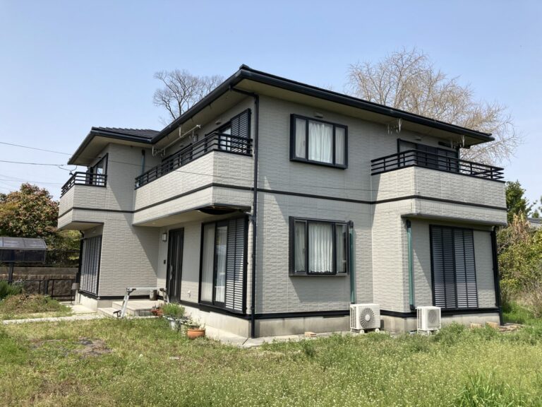 | 外壁塗料 | セミフロンスーパーアクアⅡ:色番号・・・22-60B 5分ツヤ はる一番:色番号・・・グラングレー(バルコニー外側部分) |