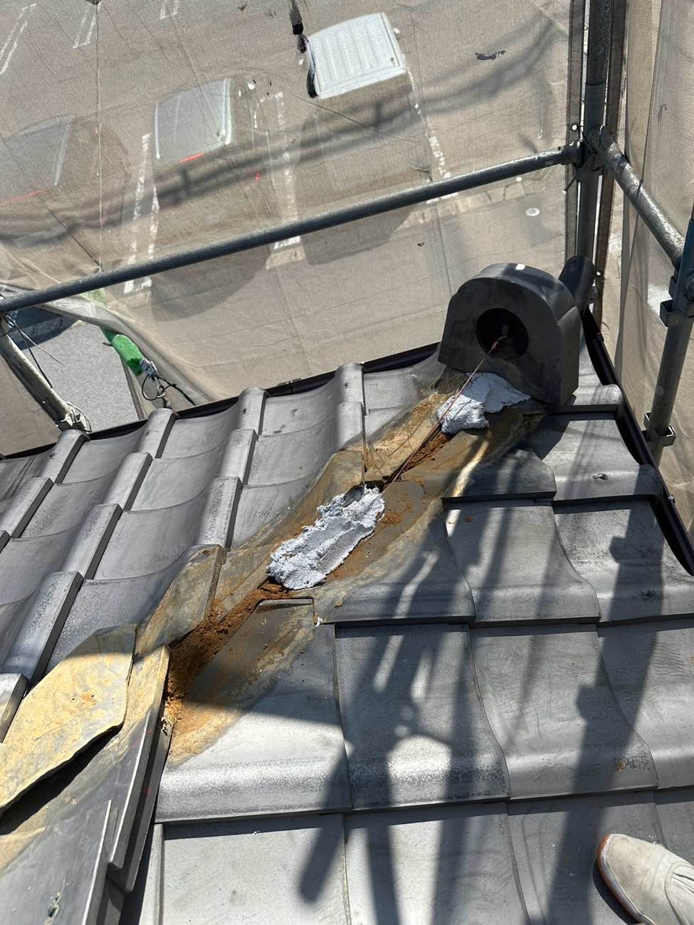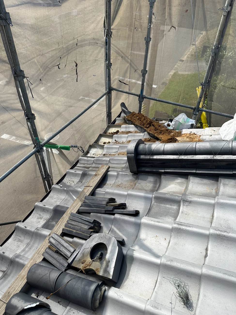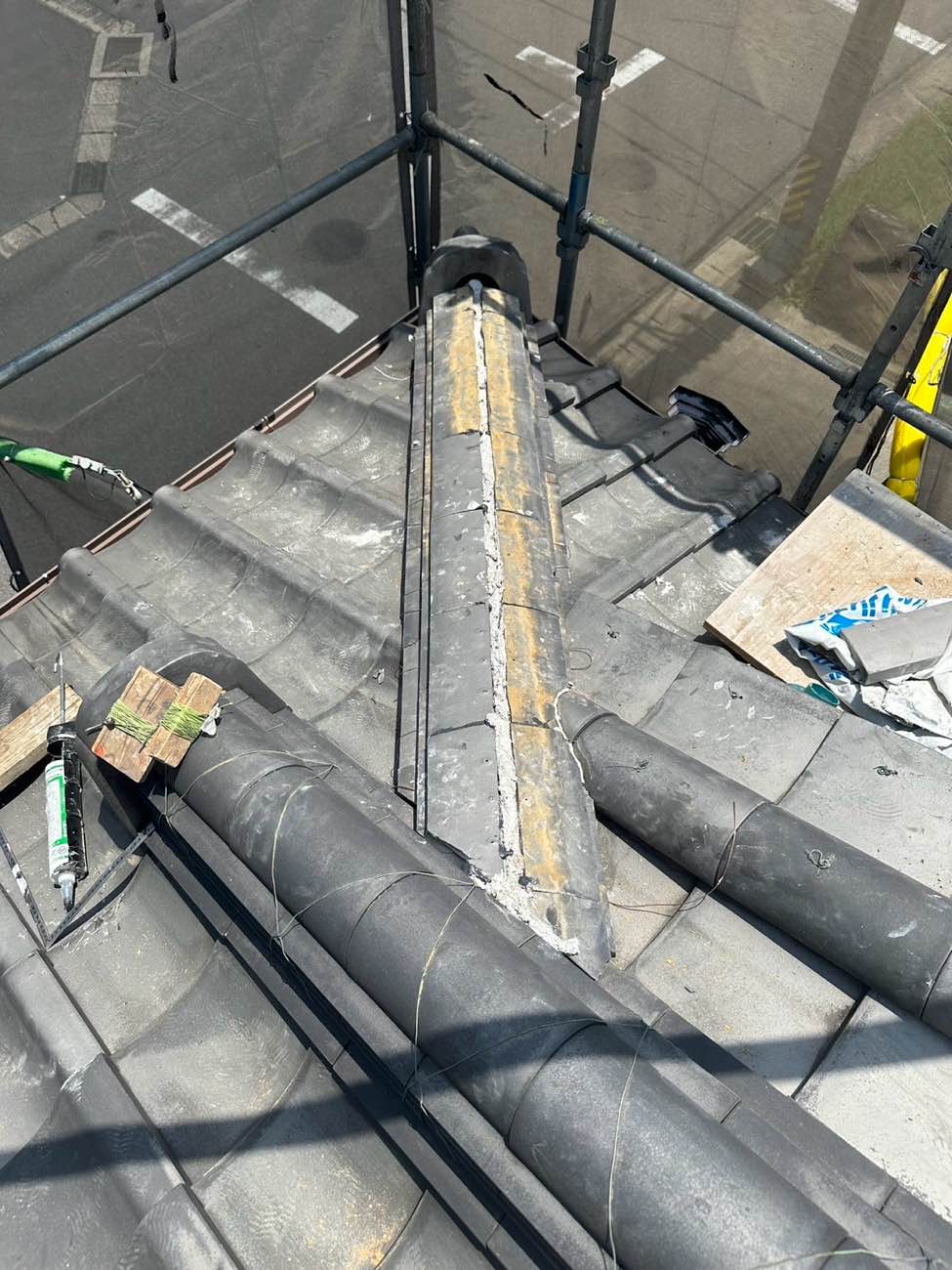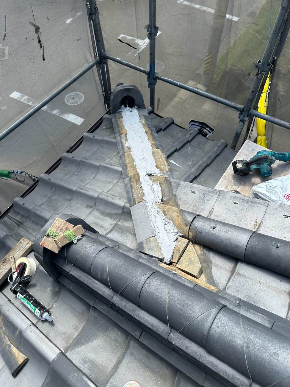 粘土や泥を接着剤として棟瓦を固定する湿式工法で、一部の瓦の葺き替え工事を行いました。